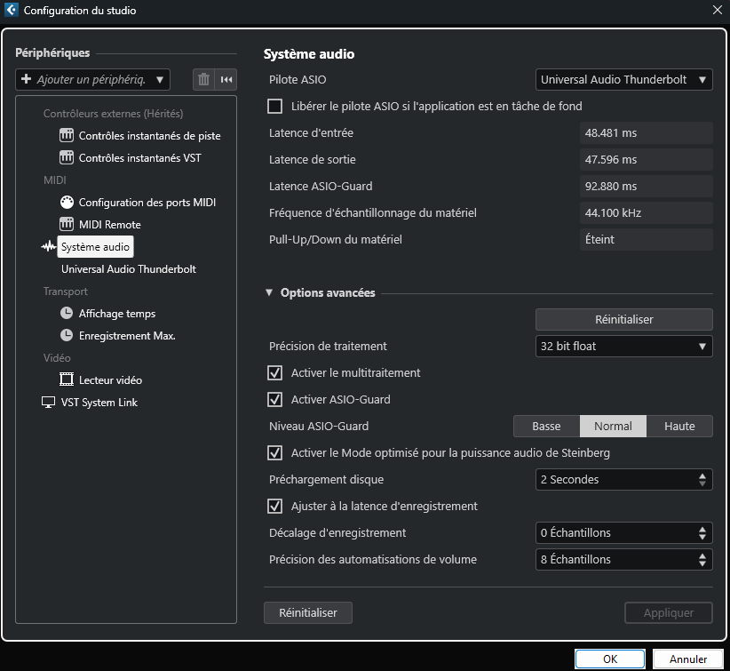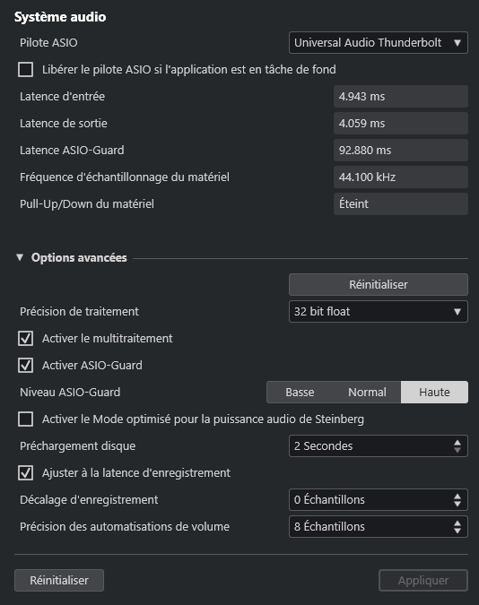 Voilà ce que j’ai de mon côté, pour te donner une idée (PC i7 acheté l’an dernier, 32 Go de RAM, Focusrite Scarlett Solo pour l’interface, buffer à 128, ASIO Guard au max, 48 KHz en 24 bits) :