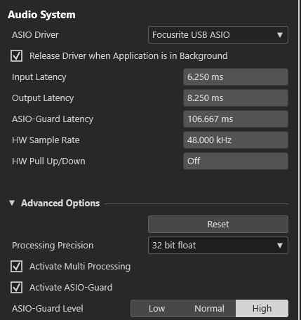 Juste pour voir, passe en Asio Guard normal avec un buffer à 512 voir à 1024. Même si la latence pourrait paraitre élevée grâce à la " force " de l’Asio à l’usage cela pourrait passer crème.