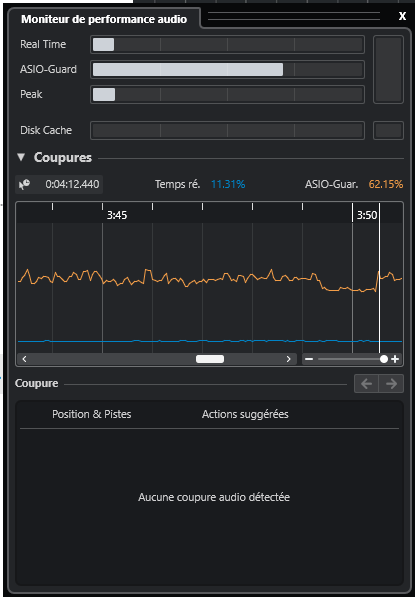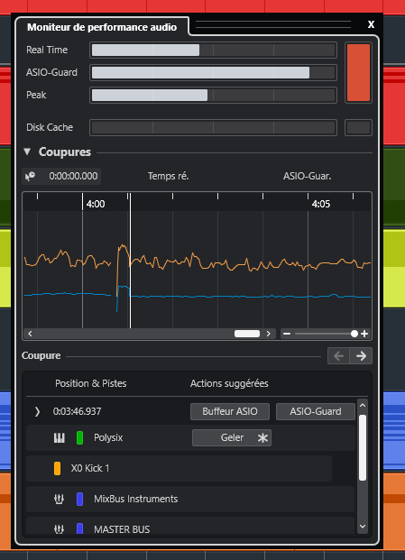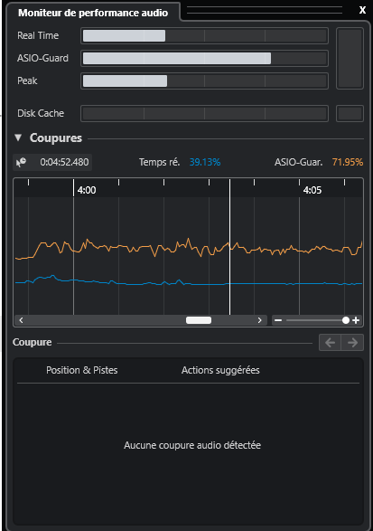 En effet mon proc plafonne au maximum à 30% d’utilisation alors que l’Asio Guard est au taquet et provoque un freeze au bout d’un laps de temps. Cubase me propose de geler certaines pistes et en effet cela fait redescendre L’Asio Guard mais je suis quand même déconcerté par la puissance de ma config et les problèmes que je rencontre avec l’Asio dans Cubase. Au final je ne peux pas tirer profit de la puissance de ma config. Si vous avez une idée pour solutionner le problème je suis à votre écoute.