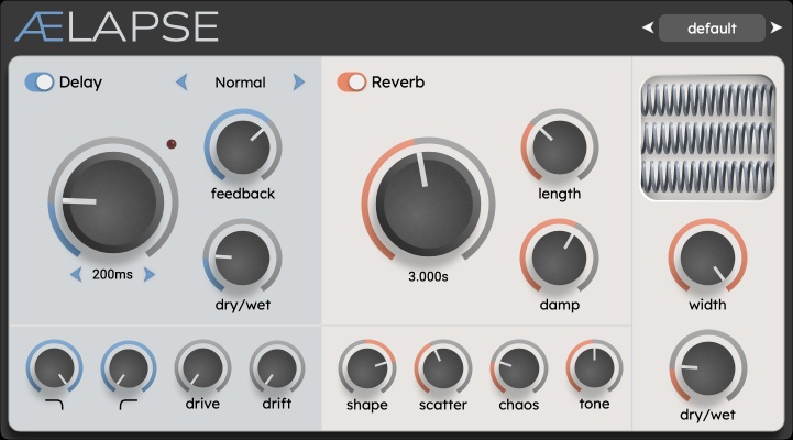 Voici ÆLAPSE, un combo d’effets original Delay à bande+Reverb à ressort réunis dans un seul plugin. Cela promet une belle palette de réglages. Les 2 sections sont activables indépendamment. Le réglage Drive va apporter de la chaleur au son par l’ajout d’harmoniques ; la section Ressort va offrir de base le son des premiers effets des amplis guitare, et bien plus.