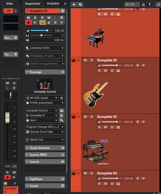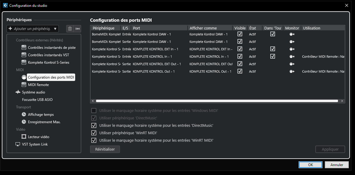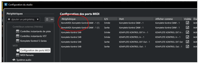 Alors en premier lieu (chose ou personne avait tilté), l’entrée comme la sortie de la configuration du Komplete Kontrol DAW – 1 était reconnu en : pilote BomeMIDI.
