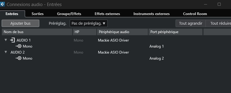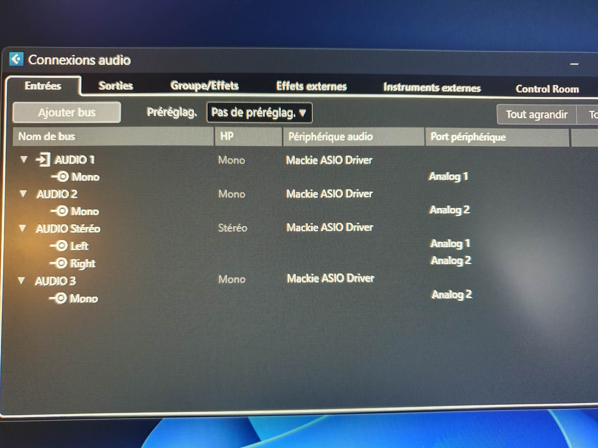 Je pense que je commencer à pas trop mal gérer (pas encore maîtriser) Cubase Pro 14 mais je suis confronté à un truc étrange. Mes enregistrements pistes par piste ce passent très bien, j’ai généralement 3 ou 4 bus d’entrée en fonction des instruments / chants etc … j’assigne donc 1 entrée par bus (pistes) généralement en mono et je créer également un piste d’entrée stéréo. Jusque là tout est OK et fonctionne très bien MAIS quand je veux enregistrer 2 pistes en même temps en simultanée (qui pourtant sont assignées chacune à 1 entrée de ma carte son) et bien les 2 instruments se retrouvent sur la même piste … JE ne comprends pas pourquoi puisque l’entrée 1 est assignée à mon bus imput 1 et l’entrée 2 à mon bus imput 2 …. donc en toute logique je ne devrais enregistrer que ce qui vient de l’entrée 1 sur le bus imput 1 non ?