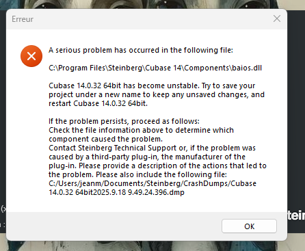 A ce point-là, il faut suivre les conseils mentionnés dans ta capture d’écran plus haut, à savoir contacter le support technique de Steinberg en incluant le fichier demandé.