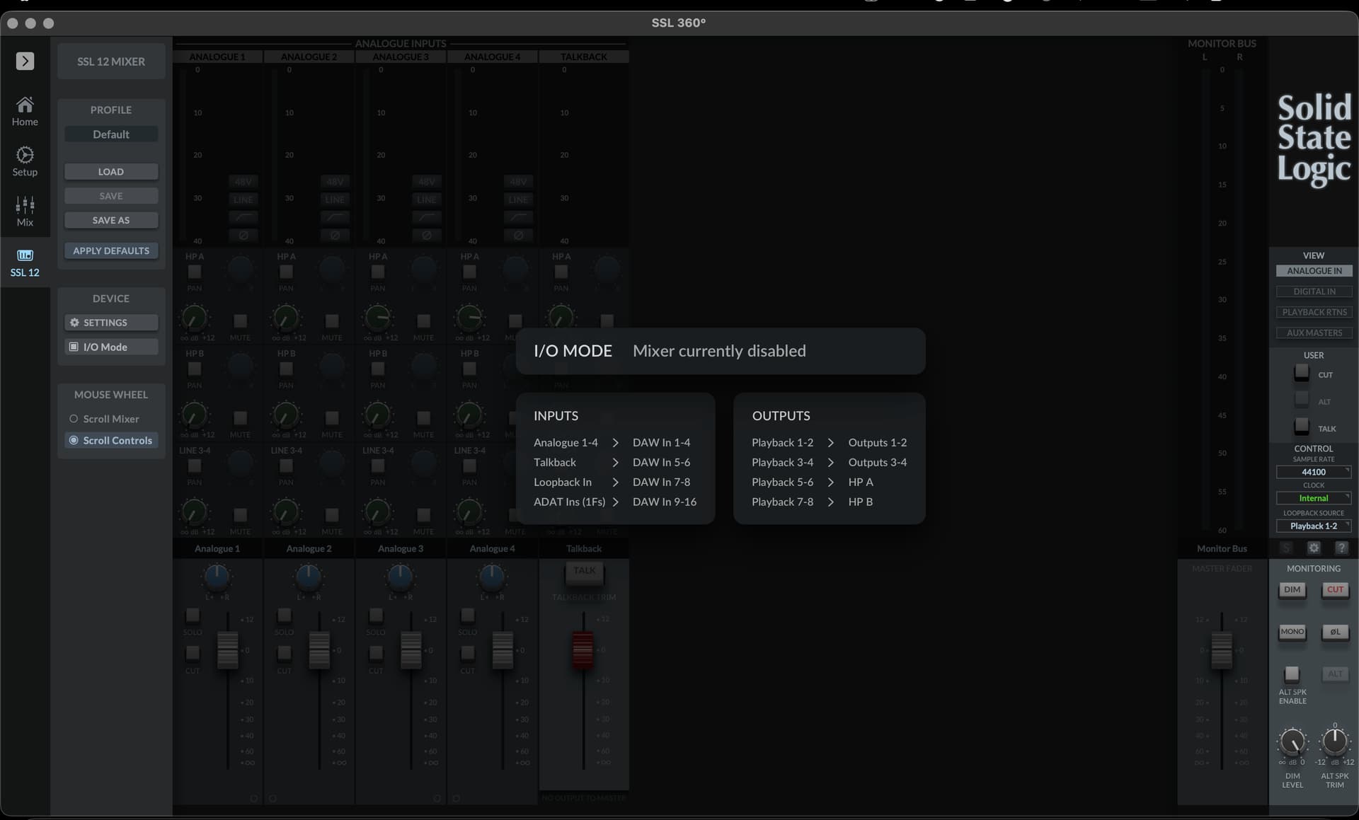 Je vous présente le problème auquel je suis confronté. J’utilise une carte son SSL12 avec le logiciel 360. Donc, dans 360 . J’ai configuré mon routage de cette façon, DAW-1 et DAW-2 correspondent aux entrées 1&2 de la carte. Pour la sortie playback 1-2. Correspond à l’out 1 & 2 sur le master. Dans Cubase, les réglages connexion audio sont comme ceci. entrée stéréo analogique 1L et analogique 2R et pour la sortie stéréo Out 1&2. Je crée une piste audio, je règle mon entrée, ma sortie, j’engage ma piste, j’active le monitor et aucun signal n’arrive à la piste. Ce problème parle-t-il à l’un d’entre vous ?